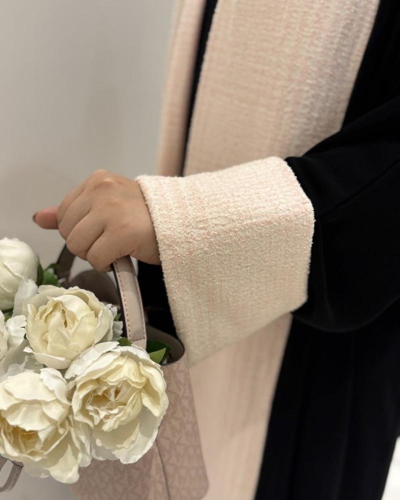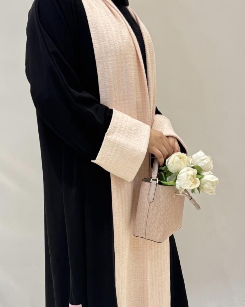 نوع القماش : كريب ملكي مع قماش شانيل باللون الوردي الدافئ = عباية ليلي